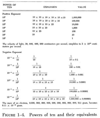 The difficulty of performing mathematical problems with very large (or very small) numbers and the counting and writing of many decimal places are both an annoyance and a source of error. The problems of representation and calculation are simplified by the use, of "powers of ten." (See figure 1-4.). This system, sometimes referred to as "Engineer's Shorthand," requires an understanding of the principles of the exponent. These are summarized as follows: (1) The positive exponent (or power) of a number is a shorthand method of indicating how many times the number is multiplied by itself. For example, 23 (read as 2 cubed or 2 to the third power) means 2 is to be multiplied by itself 3 times: 2 x 2 x 2 = 8. A number with a negative exponent may be defined as its inverse or reciprocal (1 divided by the number) with the same exponent made positive. For example, 2-3 (read as 2 to the minus 3 power) is the same as |