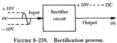 Rectification is the process of changing alternating current to direct current. When a semiconductor rectifier, such as a junction diode, is connected to an ac voltage source, it is alternately biased forward and reverse, in step with the ac voltage, as shown in figure 8-239.