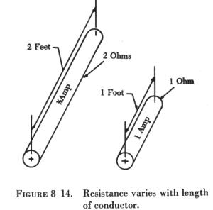 A second resistance factor is the length of the conductor. The longer the length of a given size of wire, the greater the resistance. Figure 8-14 pictures two wire conductors of different lengths. If 1 volt of electrical pressure is applied across the two ends of the conductor that is 1 foot in length and the resistance to the movement of free electrons is assumed to be 1 ohm, the current flow is limited to 1 ampere. If the same size conductor is doubled in length, the same electrons set in motion by the 1 volt applied now find twice the resistance; consequently, the current flow will be reduced by one-half.
