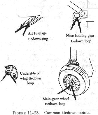 Most heavy aircraft are equipped with surface control locks which should be engaged or installed when the aircraft is secured. Since the method of locking controls will vary on different type aircraft, check the manufacturer's instructions for proper installation or engaging procedures. In case high winds are anticipated, which may damage the control surfaces or locking devices, control surface battens can also be installed to prevent damage. Figure 11-23 illustrates four common tiedown points on heavy aircraft.