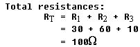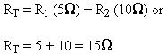 The total resistance of the circuit in figure 8-57 is 15 ohms. It is important to remember that, if the circuit were altered to include 10, 20, or even 100 resistors, the total resistance would still be the sum of all the separate resistances. It is also true that there is a certain negligible resistance in the battery, as well as in the fuse and the switch. These small values of resistance will not be considered in determining the value of current flow in this circuit.