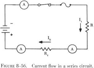 Figure 8-57 is a series circuit containing two resistances. In order to determine the amount of current flow in this circuit, it is necessary to know how much resistance or opposition the current flow will encounter. Thus, the second characteristic of series circuits is: Total resistance in a series circuit is the sum of the separate resistances in the circuit. Stated as a formula, this becomes