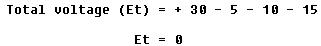 This circuit may also be solved by using the polarities of the voltages and showing that the algebraic sum of the voltages is zero. Consider voltages positive if the (+) sign is met first and negative if the (-) sign is met first when tracing the current flow. By starting at the battery and going in the direction of current flow (as indicated by the arrows) the following equation may be set up: