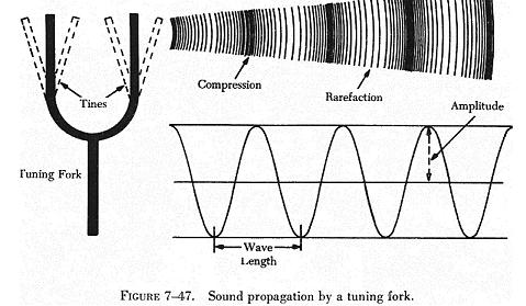 When the tine of a tuning fork (figure 7-47) moves in an outward direction, the air immediately in front of the tine is compressed so that its momentary pressure is raised above that at other points in the surrounding medium. Because air is elastic, this disturbance is transmitted progressively in an outward direction from the tine in the form of a compression wave.