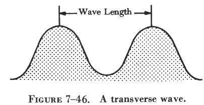 | Since sound is a wave motion in matter, it can best be understood by first considering water waves. When a stone is thrown into a pool, a series of circular waves travel away from the disturbance. In figure 7-46 such waves are diagramed as though seen in cross section, from the side. Notice that water waves are a succession of crests and troughs. The wavelength is the distance from the crest of one wave to the crest of the next. Water waves are known as transverse waves because the motion of the water molecules is up and down, or at right angles to the direction in which the waves are traveling. This can be seen by observing a cork on the water, bobbing up and down as the waves pass by; the corks moves very little from side to side. | ![]() |