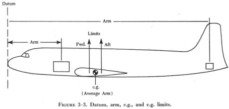 The datum is an imaginary vertical plane from which all horizontal measurements are taken for balance purposes, with the aircraft in level flight attitude. It is a plane at right angles to the longitudinal axis of the aircraft. For each aircraft make and model, all locations of equipment, tanks, baggage compartments, seats, engines, propellers, etc., are listed in the Aircraft Specification or Type Certificate Data Sheets as being so many inches from the datum. There is no fixed rule for the location of the datum. In most cases it is located on the nose of the aircraft or some point on the aircraft structure itself. In a few cases, it is located a certain distance forward of the nose section of the aircraft. The manufacturer has the choice of locating the datum where it is most convenient for measurement, locating equipment, and weight and balance computation.