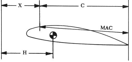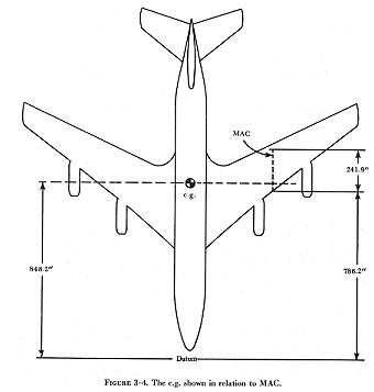 The MAC is the mean average chord of the wing. An airfoil section is a cross section of a wing from leading edge to trailing edge. A chord is usually defined as an imaginary straight line drawn parallel to the airfoil through the leading and trailing edges of the section. The MAC of a constant chord wing would be the same as the actual chord of the wing. Any departure from a rectangular wing plan form will affect the length of the MAC and the resulting distance from the MAC leading edge to the aircraft wing leading edge. Figure 3-4 shows the MAC for a sweptwing aircraft. The aircraft CG is usually placed at the maximum forward position of the center of pressure on the MAC to obtain the desired stability. Because of the relationship between the CG location and the moments produced by aerodynamic forces, the greatest of which is lift, the CG location is generally expressed with respect to the wing. This is done by specifying CG in percent of the wing's MAC. |
