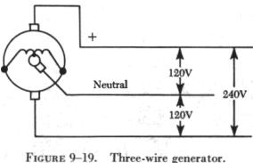 Some dc generators, called three wire generators, are designed to deliver 240 volts, or 120 volts from either side of a neutral wire (figure 9-19). This is accomplished by connecting a reactance coil to opposite sides of the commutator, with the neutral connected to the midpoint of the reactance coil. Such a reactance coil acts as a low loss voltage divider. If resistors were used, the IR loss would be prohibitive unless the two loads were perfectly matched. The coil is built into some generators as part of the armature, with the midpoint connected to a single slip ring which the neutral contacts by means of a brush. In other generators, the two connections to the commutator are connected, in turn, to two slip rings, and the reactor is located outside the generator.