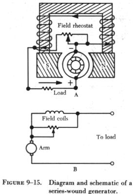 The field winding of a series generator is connected in series with the external circuit, called the load (figure 9-15). The field coils are composed of a few turns of large wire; the magnetic field strength depends more on the current flow rather than the number of turns in the coil. Series generators have very poor voltage regulation under changing load, since the greater the current through the field coils to the external circuit, the greater the induced e.m.f. and the greater the terminal or output voltage. Therefore, when the load is increased, the voltage increases; likewise, when the load is decreased, the voltage decreases. The output voltage of a series wound generator may be controlled by a rheostat in parallel with the field windings, as shown in A of figure 9-15. Since the series wound generator has such poor regulation, it is never employed as an airplane generator. Generators in airplanes have field windings which are connected either in shunt or in compound.