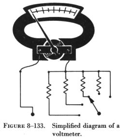 The D'Arsonval meter movement can be used either as an ammeter or a voltmeter (figure 8-133). Thus, an ammeter can be converted to a voltmeter by placing a resistance in series with the meter coil and measuring the current flowing through it. In other words, a voltmeter is a current measuring instrument, designed to indicate voltage by measuring the current flow through a resistance of known value. Various voltage ranges can be obtained by adding resistors in series with the meter coil. For low range instruments, this resistance is mounted inside the case with the D'Arsonval movement and usually consists of resistance wire having a low temperature coefficient which is wound either on spools or card frames. For higher voltage ranges, the series resistance may be connected externally. When this is done, the unit containing the resistance is commonly called a multiplier. |
