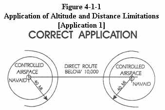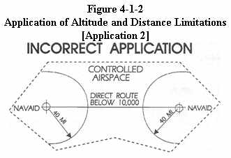 When specifying a route other than an established airway or route, do not exceed the limitations in the Table on any portion of the route which lies within controlled airspace. (For Altitude and Distance Limitations, see Table 4-1-1, Table 4-1-2, Table 4-1-3, and Table 4-1-4). (For correct application of altitude and distance limitations see Figures 4-1-1 and Figure 4-1-2).