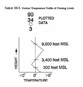 Plotted multiple crossings of the zero degree Celsius isotherm always show an inversion with warm air above subfreezing temperatures (Table 10-3). This situation can produce very hazardous icing when precipitation is occurring. Airmet ZULU (Section 4) shows more specifically the areas of expected icing. The low-level significant weather prog shows anticipated changes in the freezing level.