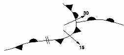 | Squall Lines - Severe squall lines are lines of CB's of 5/8's coverage or greater and pose a significant hazard to aviation. A squall line is depicted as shown below. | |