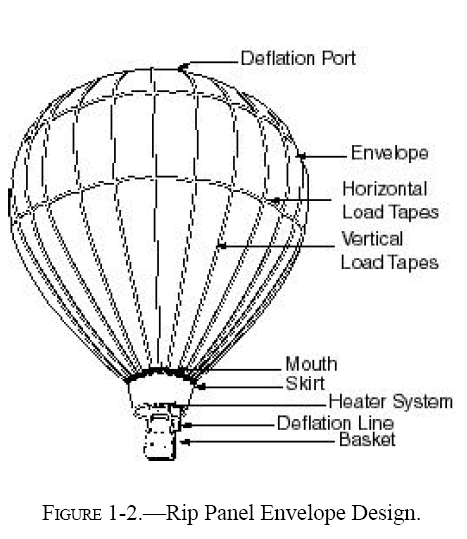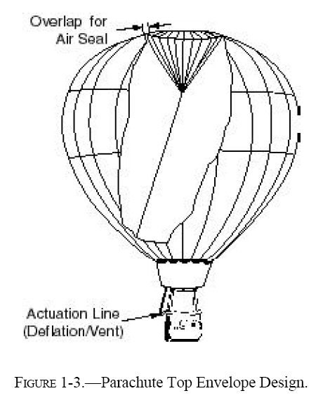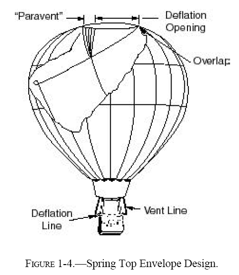 The envelope is the fabric portion of the balloon containing the hot air and is usually made of nylon. The deflation port is located at the top of the envelope and allows for the controlled release of hot air. It is covered by the deflation panel sometimes called a top cap, parachute top, or spring top (refer to figures 1-2, 1-3, and 1-4). In a balloon with a parachute top, partial opening of the parachute valve is the normal way to cool the balloon. Balloons with other types of deflation panels may have a cooling vent in the side or the top.