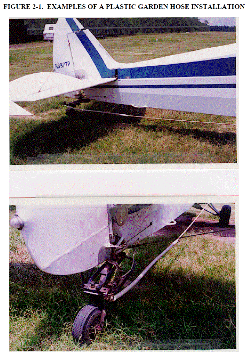 The tow hitch end of the grapple line can be stiffened to prevent it from looping around the tailwheel or the empennage as the line is deployed. Stiffening of the line may be accomplished by working a 2-foot length of stiff plastic garden hose over the line. The hose is then carefully heat formed over the knots at the ring. See Figure 2-1, Examples of a Plastic Garden Hose Installation.
