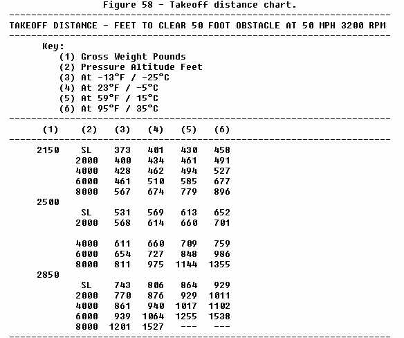 Figure 58 shows a chart that is used to compute the takeoff distance required to clear a 50-foot obstacle under various gross weight, pressure altitude, and temperature conditions. A brief study of the chart immediately reveals the previously established points, that is, as gross weight, altitude, and temperature increase, the takeoff performance decreases. This chart is used in the following way: