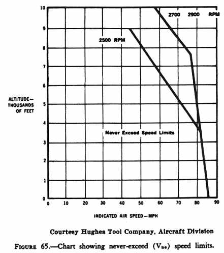 As the altitude increases, the never-exceed airspeed (red line) for most helicopters decreases. Figure 65 shows a chart from the helicopter flight manual for one model from which the Vne (never-exceed) speed can be determined for the various altitudes. At sea level, Vne is 86 miles per hour; at 6,000 feet and 2500 RPM, it is 65 MPH; and at 6,000 feet and 2700-2900 RPM, it is 78 MPH. This chart immediately points up the effect that rotor RPM has on the airspeed at which retreating blade stall is experienced.