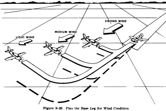 This approach is made from a base leg and requires only a 90 degree turn onto the final approach. The approach path may be varied by positioning the base leg closer to or father out from the approach end of the runway according to wind conditions (Fig. 9-26)