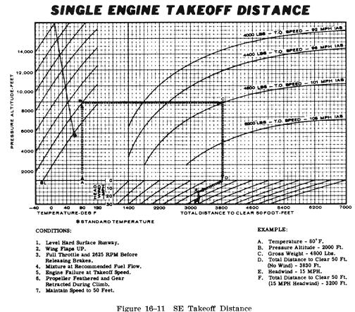 For example, use the chart in Fig. 16-10 and assume that with a temperature of 80 degrees F., a calm wind at a pressure altitude of 2,000 feet, a gross weight of 4,800 pounds, and all engines operating, the airplane being flown requires 3,525 feet to accelerate to 105 MPH and then be brought to a stop. Assume also that the airplane under the same conditions requires a distance of 3,830 feet to take off and climb over a 50 foot obstacle (Fig. 16-11) when one engine fails at 105 MPH.