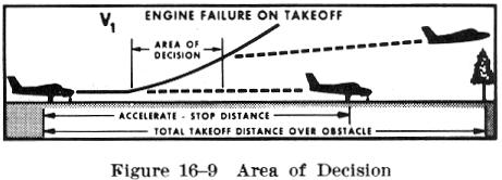 To make a correct decision in an emergency of this type, the pilot must consider the runway length, field elevation, density altitude, obstruction height, headwind component, and the airplane's gross weight. (For simplification purposes, additional factors such as runway contaminants [rubber, soot, water, ice, snow] and runway slope will not be discussed here.) The flightpaths illustrated in Fig. 16-9 indicate that the "area of decision" is bounded by: (1) the point at which Vy is reached and (2) the point where the obstruction altitude is reached. An engine failure in this area demands an immediate decision. Beyond this decision area, the airplane, within the limitations of engine out climb performance, can usually be maneuvered to a landing at the departure airport.