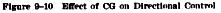 The pilot must be alert for directional control difficulties immediately upon and after touchdown due to the ground friction on the wheels. The friction creates a pivot point on which a moment arm can act. This is especially true in tailwheel type airplanes because unlike nosewheel type airplanes, the center of gravity (CG) is behind the main wheels (Fig. 9-10). Any difference between the direction the tailwheel type airplane is traveling and the direction it is headed will produce a moment about the pivot point of the wheels and the airplane will tend to swerve. Nosewheel type airplanes make the task of directional control much easier because the center of gravity being ahead of the main landing wheels, presents a moment arm which tends to straighten the airplane's path during the touchdown and after landing roll. However, this should not lull the pilot into a false sense of security.