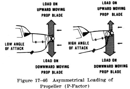 Simply stated, when the airplane is flying at a high angle of attack, the downward moving blade has a higher resultant velocity; therefore creating more lift than the upward moving blade (Fig. 17-46). This might be easier to visualize if we were to mount the propeller shaft perpendicular to the ground (like a helicopter). If there was no air movement at all, except that generated by the propeller itself, identical sections of each blade would have the same airspeed. But now, let's start air moving horizontally across this vertically mounted propeller. Now the blade proceeding forward into the flow of air will have a higher airspeed than the blade retreating with the airflow. Thus the blade proceeding into the horizontal airflow is creating more lift, or thrust, moving the center of thrust toward that blade. Now, let's visualize ROTATING the vertically mounted propeller shaft to shallower angles relative to the moving air (as on an airplane). This unbalanced thrust then will become proportionately smaller and continues getting smaller until it reaches the value of zero when the propeller shaft is exactly horizontal in relation to the moving air.