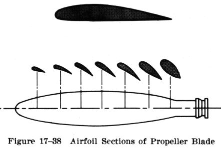 A cross section of a typical propeller blade is shown in Fig 17-38. This section or blade element is an airfoil comparable to a cross section of an airplane wing. One surface of the blade is cambered or curved, similar to the upper surface of an airplane wing, while the other surface is flat like the bottom surface of a wing. The chord line is an imaginary line drawn through the blade from its leading edge to its trailing edge. As in a wing, the leading edge is the thick edge of the blade that meets the air as the propeller rotates. |