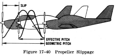 Propeller slip is the difference between the geometric pitch of the propeller and its effective pitch (Fig. 17-40). Geometric pitch is the theoretical distance a propeller should advance in one revolution; effective pitch is the distance it actually advances. Thus, geometric or theoretical pitch is based on no slippage, but actual or effective pitch includes propeller slippage in the air. |