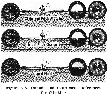 As with the other maneuvers, climbs should be performed by using both flight instruments and outside visual references (Fig. 6-8). The normal climb speed recommended by the airplane manufacturer should be used. This is usually very close to the airplane's best rate of climb airspeed, but may be slightly higher to provide better engine cooling or increased flight visibility. As a climb is started, the airspeed will gradually diminish. This reduction in airspeed is gradual, rather than immediate, because of the initial momentum of the airplane. The thrust required to maintain straight and level flight at a given airspeed is not sufficient to maintain the same airspeed in a climb; climbing flight takes more power than straight and level flight. Consequently, the engine power controls must be advanced to a higher power setting. |