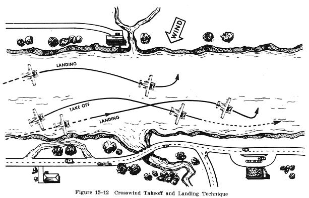 In practice, it is quite simple to plan sufficient curvature of the takeoff path to cancel out strong crosswinds, even on very narrow rivers. As illustrated in Fig. 15-12, the takeoff is started at the lee side of the river with the seaplane heading slightly into the wind. The takeoff path is then gradually made in an arc away from the wind and the liftoff accomplished on the downwind edge of the river. This pattern also allows for more climbout space into the wind.
