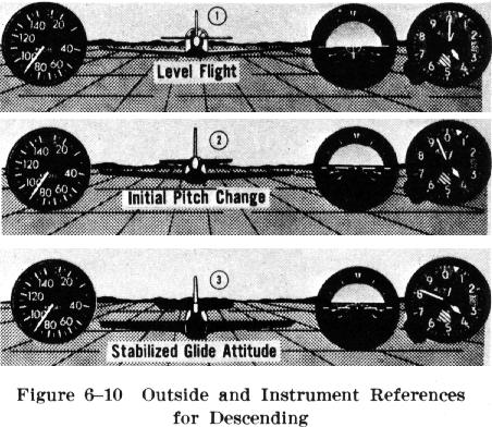 The level off from a glide must be started before reaching the desired altitude because of the airplane's downward inertia (Fig. 6-11). The amount of lead depends upon the rate of descent and the pilot's control technique. With too little lead, there will be a tendency to descend below the selected altitude. For example, assuming a 500 FPM rate of descent, the altitude must be led by 100 to 150 feet to level off at |