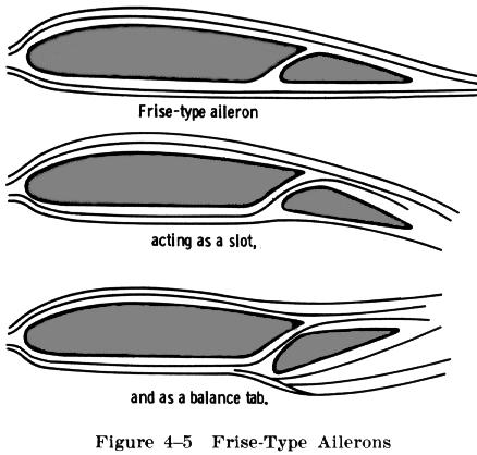The design of the aileron surface itself has also been improved by the "Frise type" aileron. With this type of aileron, when pressure on the control stick or wheel is applied to one side, raising one of the ailerons, the leading edge of that aileron (which has an offset hinge) projects down into the airflow and creates drag. This helps equalize the drag created by the lowered aileron on the opposite wing and thus reduces adverse yaw (Fig. 4-5). The Frise type aileron also forms a slot so that the air flows smoothly over the lowered aileron. This helps to make the aileron more effective at high angles of attack. However, despite these improvements, some rudder action is still needed whenever ailerons are applied. |