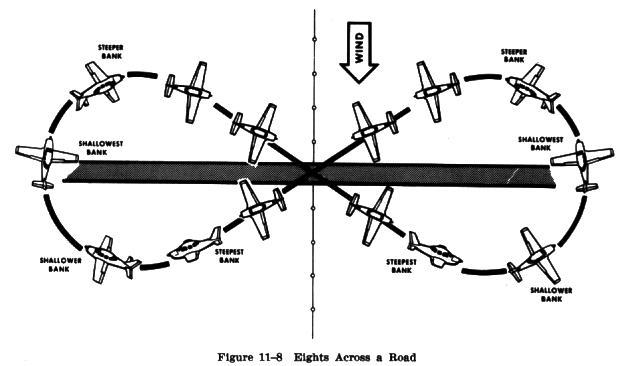 This maneuver is a variation of "eights along a road" and involves the same principles and techniques. The primary difference is that at the completion of each loop of the figure eight the airplane should cross an intersection of roads, or a specific point on a straight road (Fig. 11-8). The loops should be across the road and the wind should be perpendicular to the road. Each time the road is crossed, the crossing angle should be the same and the wings of the airplane should be level. The "eights" also may be performed by rolling from one bank immediately to the other, directly over the road.
