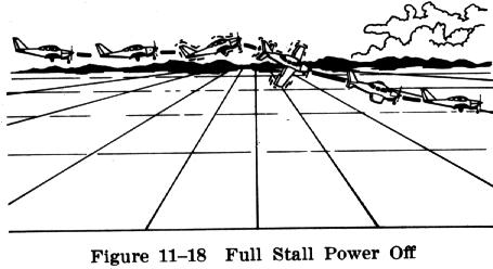 When the approach attitude and airspeed have stabilized, the airplane's nose should be smoothly raised to an attitude which will induce a stall (Fig. 11-18). Directional control should be maintained with the rudder, the wings held level by use of the ailerons, and a constant pitch attitude maintained with the elevator until the full stall occurs. The full stall will be evidenced by such clues as full up elevator, high sink rate, uncontrollable nose down pitching and possible buffeting.