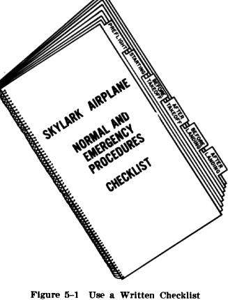 Checklists are guides for use in ensuring that all necessary items are checked in a logical sequence. The beginning pilot should not get the idea that the list is merely a crutch for poor memory - even the most experienced professional pilots never attempt to fly without an appropriate checklist. The habit of using a written checklist for the airplane being used should be so instilled in pilots that they will follow this practice throughout their flying activities (Fig. 5-1).