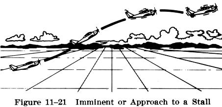An imminent stall is one in which the airplane is approaching a stall but is not allowed to completely stall. This stall maneuver is primarily for practice in retaining (or regaining) full control of the airplane immediately upon recognizing that it is almost in a full stall or that a full stall is likely to occur if timely preventive action is not taken (Fig. 11-21).