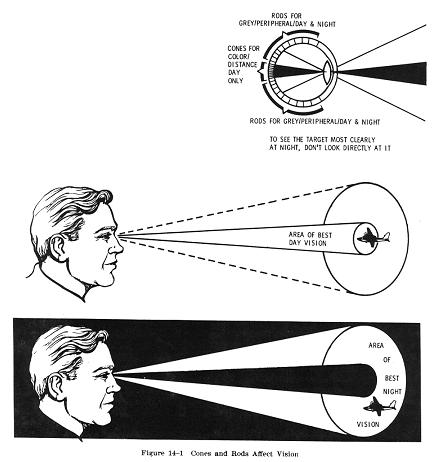The fact that the rods are distributed in a band around the cones and do not lie directly behind the pupils, makes "off center" viewing (looking to one side of an object) important during night flight (Fig. 14-1). During daylight an object can be seen best by looking directly at it, but at night a scanning procedure to permit "off center" viewing of the object is more effective. Therefore, the pilot should consciously practice this scanning procedure to improve night vision.