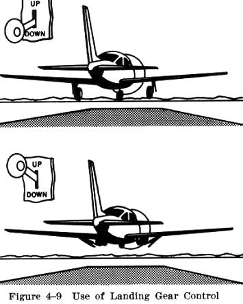 Another control in airplanes so equipped, is the control for operating the retractable landing gear. Since the purpose of the landing gear is to support the airplane while it is on the ground, it is merely excess weight and drag during flight. Though the airplane cannot be relieved of this weight while in flight, the landing gear can be retracted into the airplane structure and out of the airflow, thus eliminating the unnecessary drag (Fig. 4-9).