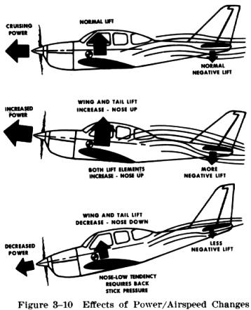 While the airplane is flying within its range of normal speeds, the airflow exerts a downward force on the horizontal stabilizer; thus, at normal cruise speed it partially offsets the inherent nose heaviness of the airplane. In addition, many airplanes have the line of thrust located lower than the CG. In this situation the propeller's thrust provides a nose up pitching force to help overcome the inherent nose heaviness. With this balanced condition, the airplane characteristically will remain in level flight. However, when the power is reduced and the airspeed is decreased, the airflow exerts less downward force on the horizontal stabilizer. At the same time the nose up force of thrust is also decreased (Fig. 3-10). Due to this unbalanced condition the airplane's nose will tend to lower and the airplane will enter a descent of its own accord.
