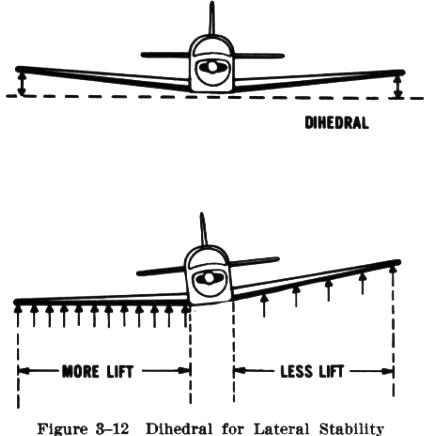 Most airplanes are designed so that the outer tips of the wings are higher than the wing roots attached to the fuselage. The upward angle thus formed by the wings is called the dihedral, and is usually only a few degrees (Fig. 3-12).