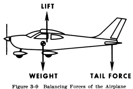 The locations of these centers in relation to each other have a significant effect on the stability of the airplane. If the center of the wing's lifting force (CP) is forward of the airplane's center of gravity (CG) - the airplane would always have a tendency to nose up and would have an inherent tendency to enter a stalled condition. Therefore, most airplanes are designed to have their CG located slightly forward of the CP, to create a nose down tendency so the airplane will have a natural tendency to pitch downward away from a stalling condition (Fig. 3-9). This provides a safety feature in the characteristics of the airplane.