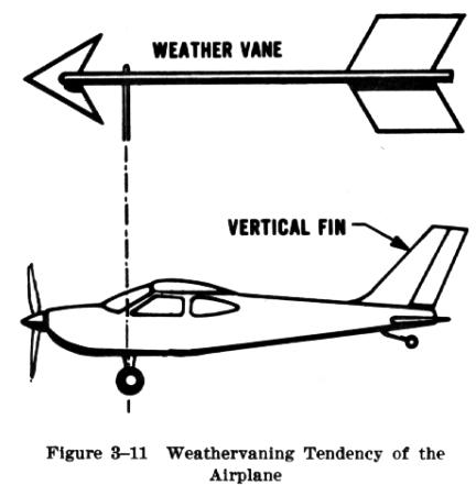 Like the feathered arrow, the most important factor producing directional stability is the weathervaning effect created by the fuselage and vertical fin of the airplane (Fig. 3-11). It keeps the airplane headed into the relative wind. If the airplane yaws, or skids, the sudden rush of air against the surface of the fuselage and fin quickly forces the airplane back to its original direction of flight.