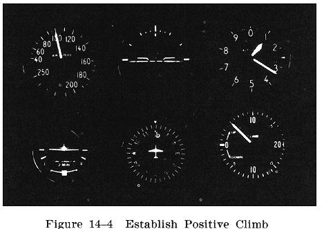 After becoming airborne, the darkness of night often makes it difficult to note whether the airplane is getting closer to or farther from the surface. It is extremely important, then, to ensure that the airplane continues in a positive climb and does not settle back to the runway. This can be accomplished by ensuring that there is a climb rate on the vertical speed indicator and a gradual but continual increase in the altimeter indication (Fig. 14-4). It is also important to note that the airspeed is well above the stall speed and that it continues to accelerate.
