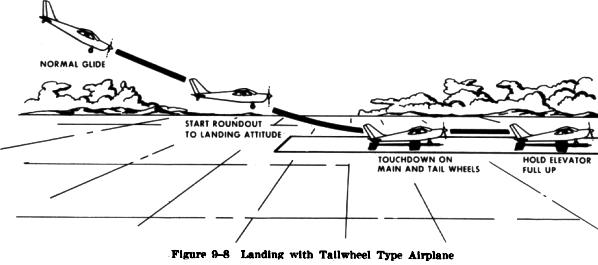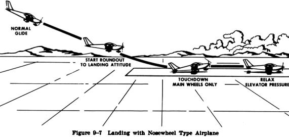 Nosewheel type airplanes should contact the ground in a tail low attitude, with the main wheels touching down first so that little or no weight is on the nosewheel (Fig. 9-7). In tailwheel type airplanes, the roundout and touchdown should be so timed that the wheels of the main landing gear and tailwheel touch down simultaneously (3 point landing). This requires fine timing, technique, and judgment of distance and altitude (Fig. 9-8).