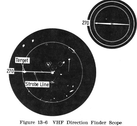 The VHF/DF operator on the ground can note the airplane's bearing from the facility by looking at a scope, quite similar to a radar scope. Each time the pilot transmits, it shows up on the scope as a line radiating out from the center (Fig. 13-6). From this the operator reads the course the pilot should fly (with zero wind conditions) to reach the facility. The pilot need not be concerned about wind drift since subsequent heading instructions will consider the position to which the airplane has drifted and a new course plotted.