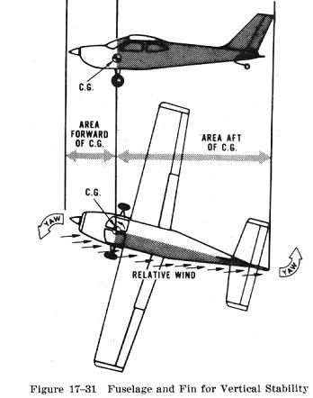 Similarly in an airplane, the designer must ensure positive directional stability by making the side surface greater aft than ahead of the center of gravity (Fig. 17-31). To provide more positive stability aside from that provided by the fuselage, a vertical fin is added. The fin acts similar to the feather on an arrow in maintaining straight flight. Like the weathervane and the arrow the farther aft this fin is placed and the larger its size, the greater the airplane's directional stability.