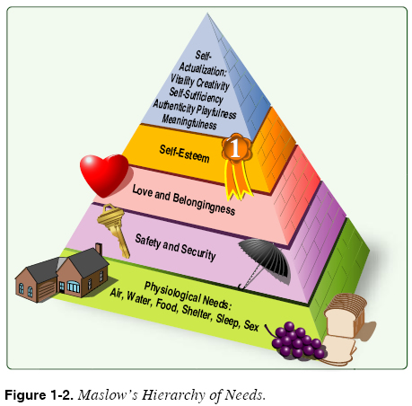 Murray’s research underpins the work of psychologist Abraham Maslow who also studied human needs, motivation, and personality. While working with monkeys during his early years of research, he noticed that some needs take precedence over others. For example, thirst is relieved before hunger because the need for water is a stronger need than the need for food. In 1954, Maslow published what has become known as Maslow’s Hierarchy of Needs which remains valid today for understanding human motivation. [Figure 1-2] According to Maslow, human needs go beyond the obvious physical needs of food and shelter to include psychological needs, safety and security, love and belongingness, self esteem, and self actualization to achieve one’s goals.