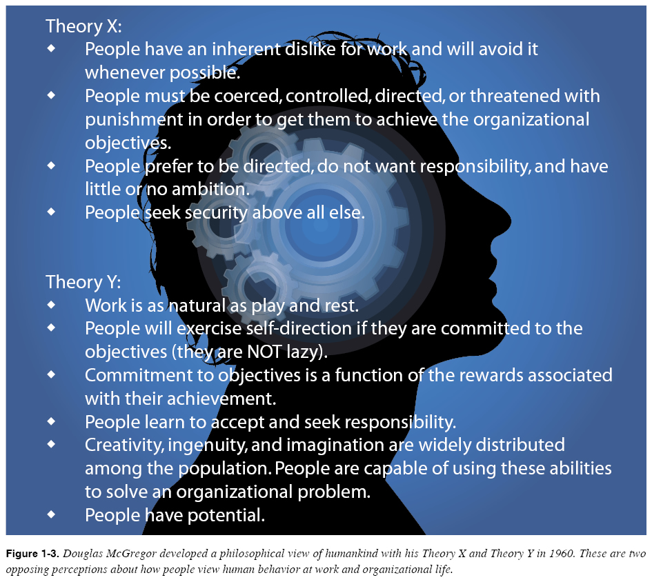 Building on Maslow’s hierarchy of needs, social psychologist Douglas McGregor set out two opposing assumptions about human nature and motivation in 1960. [Figure 1-3] Although McGregor’s famous X-Y Theory was designed for use in human resource management, it offers information about how people view human behavior at work and organizational life which makes it useful for aviation instructors.