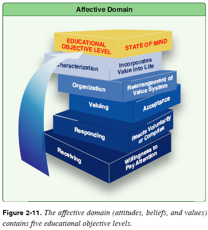 Affective Domain The affective domain addresses a learner’s emotions toward the learning experience. It includes feelings, values, enthusiasms, motivations, and attitudes. [Figure 2-11] For the aviation instructor, this may mean how the student approaches learning. Is he or she motivated to learn? Does he or she exhibit confidence in learning? Does the student have a positive attitude toward safety?