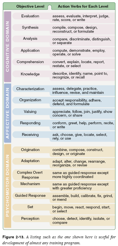 These additional levels of learning are the basis of the knowledge, attitude, and skill learning objectives commonly used in advanced qualification programs for airline training. They also can be tied to the PTS to show the level of knowledge or skill required for a particular task. A list of action verbs for the three domains shows appropriate behavioral objectives at each level. [Figure 2-13] Instructors who are familiar with curriculum development recognize that the action verbs are examples of performance-based objectives.